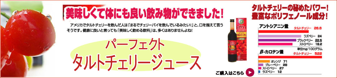 株式会社パーフェクトのインターネット通信販売サイトです。 取扱商品の健康食品(サプリメント)は、「パーフェクトタルトチェリープロ」、「パーフェクトタルトチェリージュース」、「パーフェクトEMエッセンス フェイスマスク」となります。 中でも比較的に珍しいタルトチェリーを原料としたジュースの製造・販売をしております。 只今、販売代理店募集中です。お問合せページよりご連絡下さい。